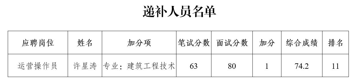 根據(jù)《瀘州阜陽投資集團(tuán)有限公司關(guān)于合江縣城市開發(fā)投資(集團(tuán))有限公司下屬子公司合江縣華陽水業(yè)有限公司2020年公開招聘工作人員的公告》的規(guī)定,按綜合成績(jī)排名,因1名擬聘用人員自動(dòng)放棄,現(xiàn)將擬聘用人員的遞補(bǔ)人員名單面向社會(huì)公示7個(gè)工作日,公示時(shí)間2020年7月8日至2020年7月16日。公示期間,如有問題,請(qǐng)及時(shí)向?yàn)o州阜陽投資集團(tuán)有限公司組織與人力資源管理部反映。要求舉報(bào)者署實(shí)名,實(shí)事求是地反映問題,并提供必要的調(diào)查線索。