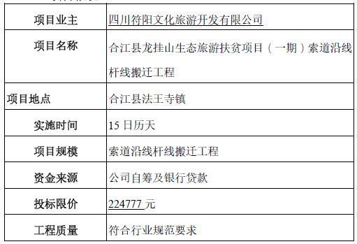 請通過資格審查的參加競爭性談判人員帶好有效身份證、公司介紹信、授權委托書、資質證明等資料的原件與復印件(上述復印件須蓋單位鮮章,原件查驗后當場退還。于北京時間2019年9月18日9:00,在四川省瀘州市合江縣荔城大道190號四川符陽文化旅游開發(fā)有限公司二樓會議室公開舉行合江縣龍掛山生態(tài)旅游扶貧項目(一期)索道沿線桿線搬遷工程競爭性談判活動,四川符陽文化旅游開發(fā)有限公司根據承諾報價最低價原則確定中選人。