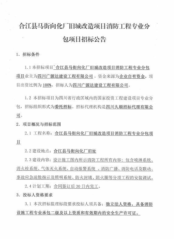 合江縣馬街向化廠舊城改造項目消防工程專業(yè)分包項目招標(biāo)公告