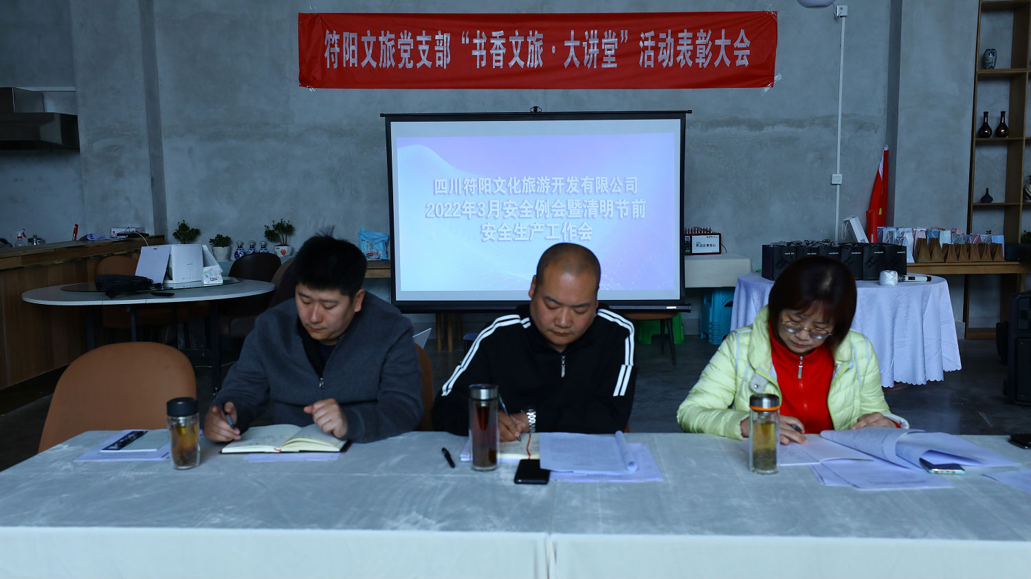 2022 年 3 月 24 日 , 符 陽(yáng) 文 旅 公 司 召 開 3 月 安 全 生 產(chǎn) 工 作會(huì)。 總經(jīng)理吳平主持會(huì)議, 全體員工參加。 會(huì)上, 譙棣升 董事長(zhǎng)圍繞交通運(yùn)輸安全、 在建項(xiàng)目安全、 森林防滅火安全、 地質(zhì)災(zāi)害防范、 酒店經(jīng)營(yíng)安全等幾個(gè)方面作了講話, 強(qiáng)調(diào)每 個(gè)員工都有安全責(zé)任, 發(fā)現(xiàn)違章作業(yè)要大膽制止, 保證安全 生產(chǎn)。