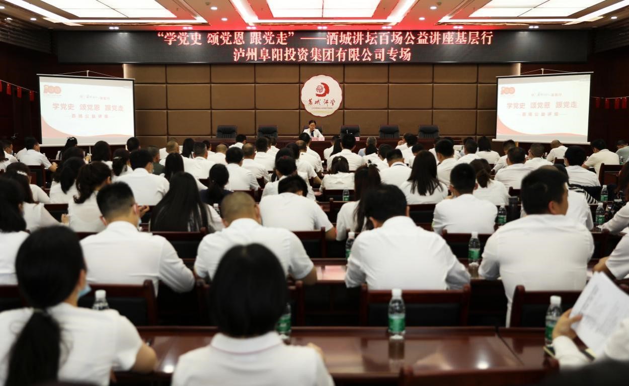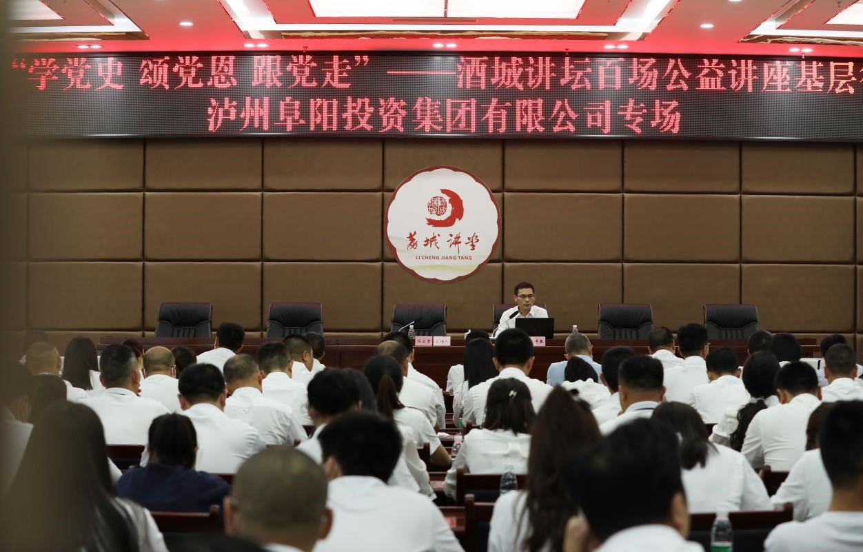 5月19日下午,“學黨史頌黨恩跟黨走”——酒城講壇百場公益講座基層行瀘州阜陽投資集團有限公司專場在政務中心15樓會議室舉行?;顒佑牲h委書記、董事長游啟君主持,合江縣委宣傳部派出指導人員,集團全體領導班子、本部及下屬公司職工200余人參加。