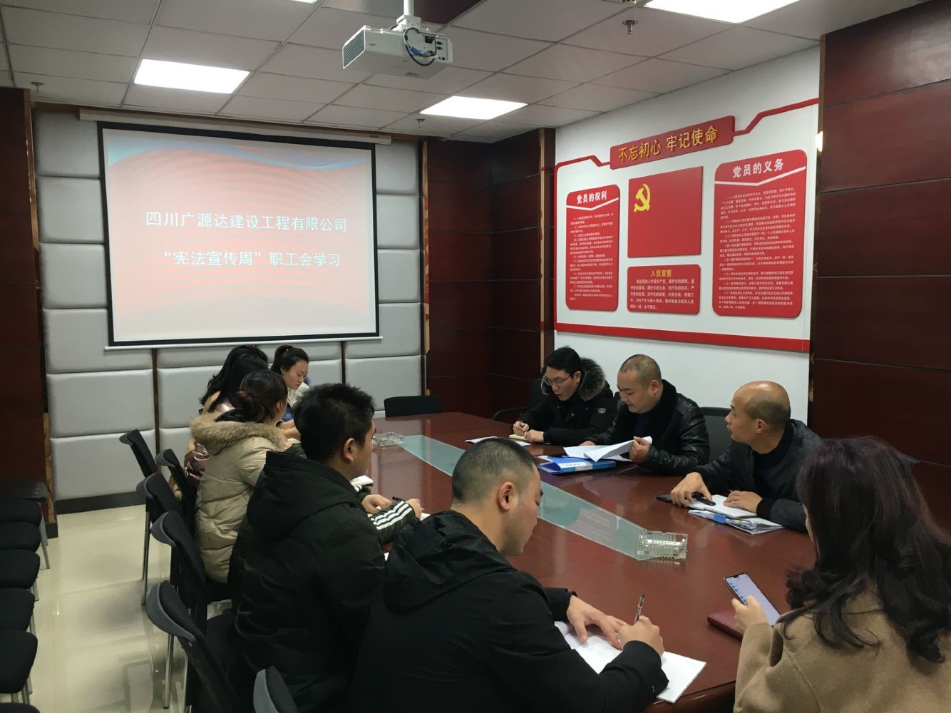 2019年11月3日,四川廣源達(dá)建設(shè)工程有限公司譙棣升董事長主持召開“憲法宣傳周”職工學(xué)習(xí)會議,公司全體職工參加。