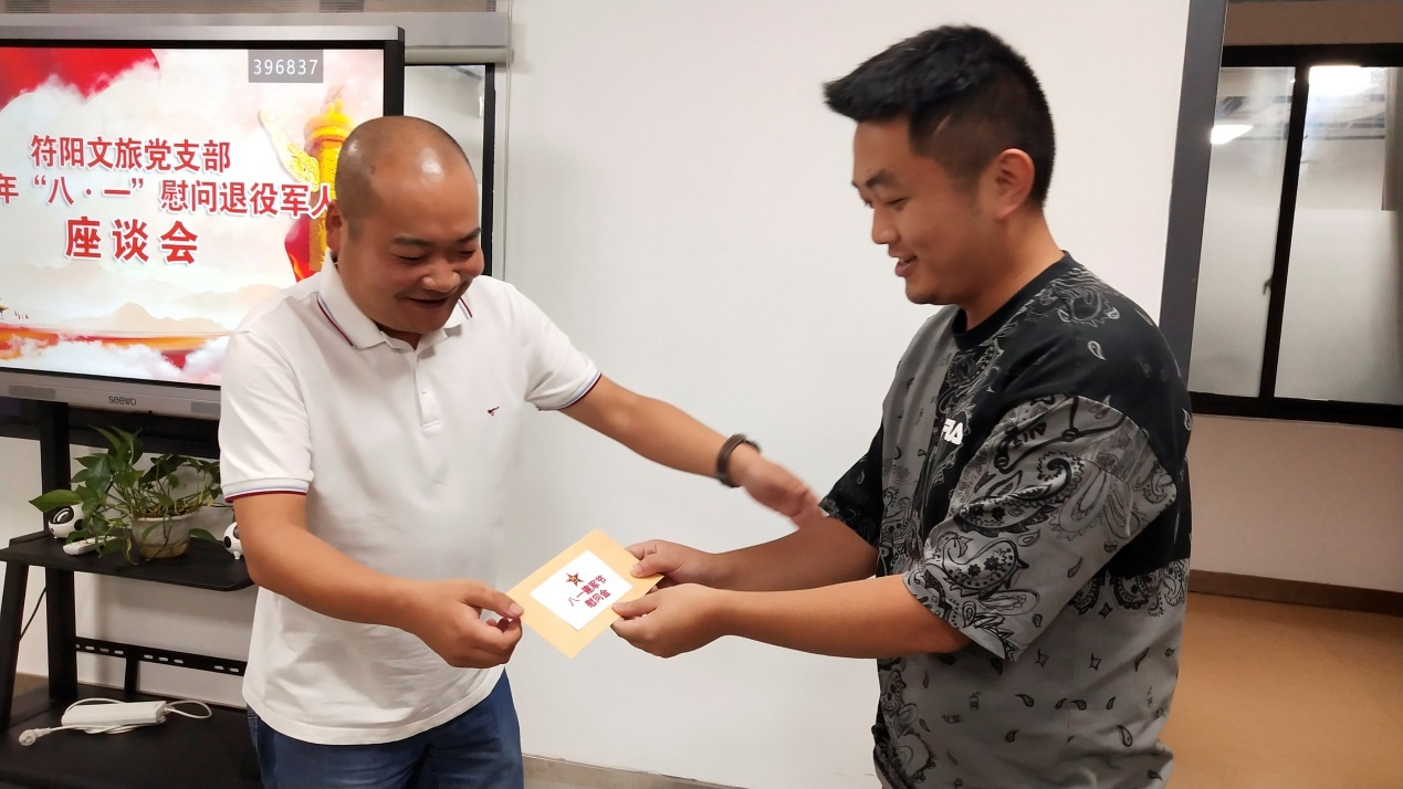 為扎實做好擁軍優(yōu)屬 、 擁政愛民工作 , 在 “ 八 一 ” 建軍節(jié)來臨之際, 符陽文旅黨支部開展 “ 八一 ” 慰問活動, 組織文旅 公司工作的退役軍人召開座談會, 了解他們的工作和生活情 況, 為他們送上慰問金, 并致以節(jié)日的祝福。 退役軍人表示 感受到公司的關懷和愛心,在今后的工作中發(fā)揮軍人本色, 為公司發(fā)展貢獻力量。
